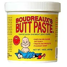 Boudreaux's Butt Paste is an American brand of skin cream that began as a remedy for diaper rash.[1][2] It has also been used for the treatment of various skin ailments including psoriasis, jock itch, shingles, chafing, cold sores and acne.[3][4]