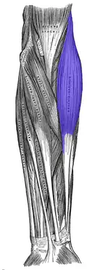 The brachioradialis is a muscle of the forearm that flexes the forearm at the elbow.[1][2] It is also capable of both pronation and supination, depending on the position of the forearm.[2] It is attached to the distal styloid process of the radius by way of the brachioradialis tendon, and to the lateral supracondylar ridge of the humerus.
