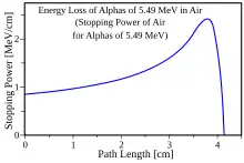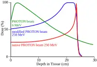 When a fast charged particle moves through matter, it ionizes atoms of the material and deposits a dose along its path. A peak occurs because the interaction cross section increases as the charged particle's energy decreases. Energy lost by charged particles is inversely proportional to the square of their velocity, which explains the peak occurring just before the particle comes to a complete stop.[4] In the upper figure, it is the peak for alpha particles of 5.49 MeV moving through air. In the lower figure, it is the narrow peak of the "native" proton beam curve which is produced by a particle accelerator of 250 MeV. The figure also shows the absorption of a beam of energetic photons (X-rays) which is entirely different in nature; the curve is mainly exponential.