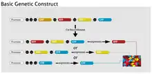 Brainbow-1 uses DNA constructs with different fluorescent protein genes (XFPs) separated by mutant and canonical forms of loxP. This creates a set of mutually exclusive excision possibilities, since cre-mediated recombination occurs only between identical loxP sites.[1] After recombination occurs, the fluorescent protein that is left directly after the promoter is uniquely expressed. Thus, a construct with four XFPs separated by three different loxP sites, three excision events, and the original construct can produce four different fluorescent proteins.[4]
