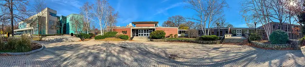 In 1954, Brandeis began construction on an interfaith center consisting of separate Roman Catholic, Protestant, and Jewish chapels.[59] Designed by the architectural firm of Harrison & Abramovitz, the three chapels surrounded a natural pond.[59] Brandeis announced that no official chaplains would be named, and attendance at chapel services would not be required.[59] The Roman Catholic chapel was named Bethlehem, meaning house of bread, and it was dedicated on September 9, 1955.[60] Dedicated on September 11, 1955, the Jewish chapel was named in memory of Mendel and Leah Berlin, parents of Boston surgeon David D. Berlin.[61] Named in memory of Supreme Court Justice John Marshall Harlan, the Protestant chapel was dedicated on October 30, 1955.[61]