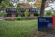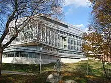 In 1956, Brandeis received a one-million-dollar donation from New York industrialist Jack A. Goldfarb to build a library.[62][63] The building, named the Bertha and Jacob Goldfarb Library in his honor, was designed by Harrison & Abramovitz, a firm which designed many campus buildings in the 1950s.[63] Built of brick and glass, the library was designed to hold 750,000 volumes.[63]