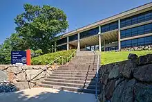 On January 8, 1969, about 70 black students entered then-student-center, Ford Hall, ejected everyone else from the building, and refused to leave.[73] The students' demands included the hiring of more black faculty members, increasing black student enrollment from four percent to ten percent of the student body,[74] establishing an independent department on African American studies,[75] and an increase in scholarships for black students.[76] Over 200 white students staged a sit-in in the lobby of the administration building.[77] President Morris B. Abram said that, although he recognized "the deep frustration and anger which black students here and all over the country feel at what must seem—and often is—the indifference and duplicity of white men in relation to blacks",[77] the students' actions were an affront to the university. The faculty condemned the students' actions as well.[74] On the fourth day of the protest, the Middlesex Superior Court issued a temporary restraining order, requiring the students to leave Ford Hall.[75] While Abram did not allow the order to forcibly remove the students from Ford Hall to be enforced, 65 students had been suspended for their actions.[77] On January 18, the black students exited Ford Hall, ending the eleven-day occupation of the building.[78] There had been no violence or destruction of property during the occupation, and Brandeis gave the students amnesty for their actions.[78] Ronald Walters became the first chair of Afro-American studies at Brandeis later the same year.[79] Ford Hall was demolished in August 2000 to make way for the Shapiro Campus Center, which was opened and dedicated October 3, 2002.