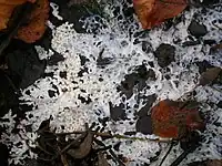 Brefeldia maxima is a species of non-parasitic plasmodial slime mold, and a member of the class Myxomycetes. It is commonly known as the tapioca slime mold because of its peculiar pure white, tapioca pudding-like appearance.[3] A common species with a worldwide distribution, particularly in North America and Europe.[4] It is often found on bark after heavy rain or excessive watering. Their spores are produced on or in aerial sporangia and are spread by wind,[5] however beetles of the family Latridiidae are also reported to disperse the spores.[6] Bonner states that soil invertebrates and rain mainly disperse spores as they are sticky and unlikely to be carried by air currents.[7]
