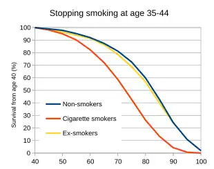 Survival from age 40 of non-smokers, cigarette smokers and ex-smokers who stopped smoking between 35 and 44 years old[1]