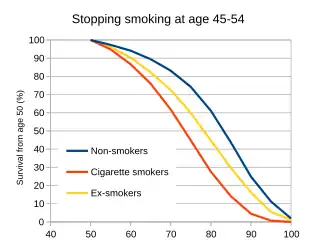 Survival from age 50 of non-smokers, cigarette smokers and ex-smokers who stopped smoking between 45 and 54 years old[1]