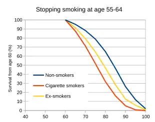 Survival from age 60 of non-smokers, cigarette smokers and ex-smokers who stopped smoking between 55 and 64 years old[1]