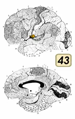 Brodmann area 43, the subcentral area, is a structurally distinct area of the cerebral cortex defined on the basis of cytoarchitecture. Along with Brodmann Area 1, 2, and 3, Brodmann area 43 is a subdivision of the postcentral region of the brain,[1] suggesting a somatosensory ('feeling of the body') function. The histological structure of Area 43 was initially described by Korbinian Brodmann, but it was not labeled on his map of cortical areas.[2]