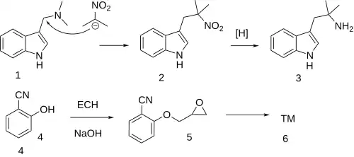 The displacement of the dimethylamino group in gramine (1) by the anion from 2-nitropropane gives 3-(2-methyl-2-nitropropyl)indole (2), which is reduced to the amine alpha,alpha-dimethyltryptamine (3). Separately, the reaction of 2-hydroxybenzonitrile (4) with epichlorohydrin gives the epoxide (5). Combination of the two intermediates (3) and (5) gives bucindolol.[6][7]