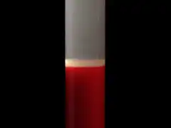 After centrifugation, one can distinguish a layer of clear fluid (the plasma), a layer of red fluid containing erythrocytes, and a thin layer in between. Composing less than 1% of the total volume of the blood sample, the buffy coat (so-called because it is usually buff in hue), contains most of the leukocytes and thrombocytes.[2][3] The buffy coat is usually whitish in color, but is sometimes green if the blood sample contains large amounts of neutrophils, which are high in green-colored myeloperoxidase.
