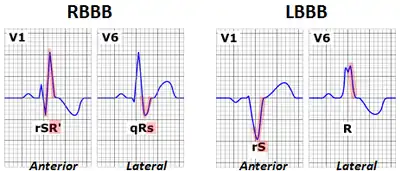 A simple way to quickly differentiate between the two types is to note the deflection of the QRS complex in the V1 lead. A (V1) QRS segment deflected down indicates left bundle branch block, while a deflection up indicates right bundle branch block. In both types, the QRS is wide (> 0.12 seconds).