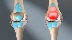 Bursitis is the inflammation of one or more bursae (synovial sacs) of synovial fluid in the body. They are lined with a synovial membrane that secretes a lubricating synovial fluid.[1] There are more than 150 bursae in the human body.[1] The bursae rest at the points where internal functionaries, such as muscles and tendons, slide across bone. Healthy bursae create a smooth, almost frictionless functional gliding surface making normal movement painless. When bursitis occurs, however, movement relying on the inflamed bursa becomes difficult and painful. Moreover, movement of tendons and muscles over the inflamed bursa aggravates its inflammation, perpetuating the problem. Muscle can also be stiffened.