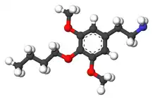 Buscaline (3,5-dimethoxy-4-butoxyphenethylamine) is a chemical compound prepared as a possible psychedelic drug. It is an analog of mescaline. Buscaline was first synthesized by Alexander Shulgin. In his book PiHKAL, the minimum dosage is listed as 150 mg, and the duration is "several hours".[1] Buscaline produces no psychedelic or psychoactive effects, but causes heart arrhythmia and light diarrhea. It does not cause any visuals or insights.[1] Very little data exists about the pharmacological properties, metabolism, and toxicity of buscaline.