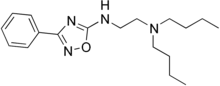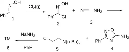 The reaction of benzamidoxime (1) with chlorine and subsequent reaction with cyanamide (3) gives 5-amino-3-phenyl-1,2,4-oxadiazole (4).[2][3][4] Base catalyzed alkylation with dibutylaminoethyl chloride (5) completes the synthesis of butalamine (6).