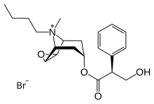It is a quaternary ammonium compound and a semisynthetic derivative of hyoscine hydrobromide (scopolamine). The attachment of the butyl-bromide moiety effectively prevents the movement of this drug across the blood–brain barrier, effectively minimising undesirable central nervous system side effects associated with scopolamine/hyoscine.[25]