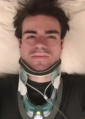 ![]() A man in a hospital bed wearing a cervical collar following a suspected spinal cord injury |
