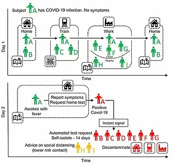 ![]() Example proposal for a location-based COVID-19 contact tracing app: Contacts of individual A (and all individuals using the app) are traced using GPS co-localizations with other app users, supplemented by scanning QR codes displayed on high-traffic public amenities where GPS is too coarse. Individual A requests a SARS-COV-2 test (using the app) and their positive test result triggers an instant notification to individuals who have been in close contact. The app advises isolation for the case (individual A) and quarantine of their contacts.[1] | |