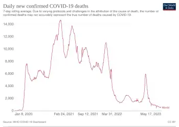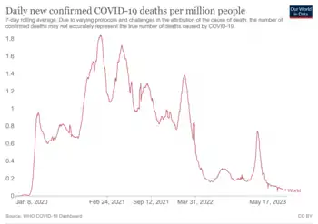 - ↑ "Timeline of weekly new confirmed COVID-19 deaths worldwide". Our World in Data. COVID-19 Data Explorer. The map and table tabs have exact numbers by country. Drag the table timeline for country numbers by date. The graph at the source is interactive and provides more detail by date.