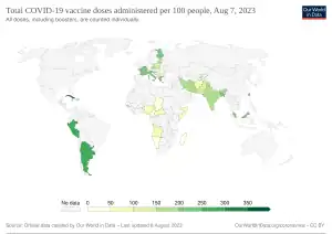 - ↑ World map of COVID-19 vaccine doses administered per 100 people by country. From Our World in Data. Chart tab has timeline graph of doses administered per 100 people by country and also the world.
