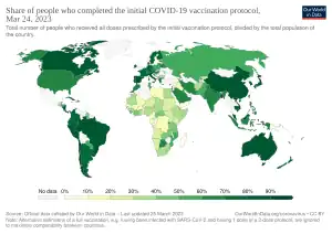 - ↑ World map of share of people who are fully vaccinated against COVID-19 by country relative to its population. From Our World in Data. Chart tab has timeline graph of share of people who are fully vaccinated by country relative to its population and also the world.