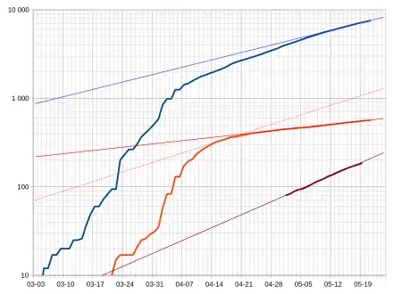 - On 12 March, five new cases of COVID-19 were recorded, as well as the first death from the disease.[27] A second death was recorded shortly after.[28][29] The ministry of Health, Population and Hospital Reform began reporting recoveries, stating that eight patients had recovered.[30] On the same day, schools were locked due to the coronavirus spread,[31] and all cultural events were postponed.[32]