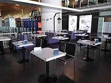 ![]() Tables arranged for social distancing at Beijing Capital International Airport in March 2020 | |