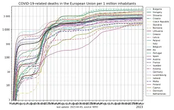 By March 2021, Belgium had the third highest number of COVID-19 deaths per head of population in the world, according to data compiled by Johns Hopkins University. However, Belgium may have been over-reporting the number of cases, with health officials reporting that suspected cases were being reported along with confirmed cases.[9] Unlike some countries that publish figures based primarily on confirmed hospital deaths, the death figures reported by the Belgian authorities included deaths in the community, such as in care homes, confirmed to have been caused by the virus, as well as a much larger number of such deaths suspected to have been caused by the virus, even if the person was not tested.[10]