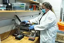 ![]() A UC Davis engineer using COVID-19 testing equipment | |