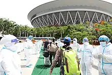 In April 2020, the national government began converting the ASEAN Convention Center at the Clark Freeport Zone, Pampanga and the National Government Administrative Center in Capas, Tarlac to COVID-19 quarantine facilities.[16] The Iglesia ni Cristo also allowed the national government to lend the Philippine Arena at the Ciudad de Victoria in Bulacan to be re-purposed for the same reason. The INC also offered the Garden Suites, also within the CDV as temporary residence for health workers.[17]