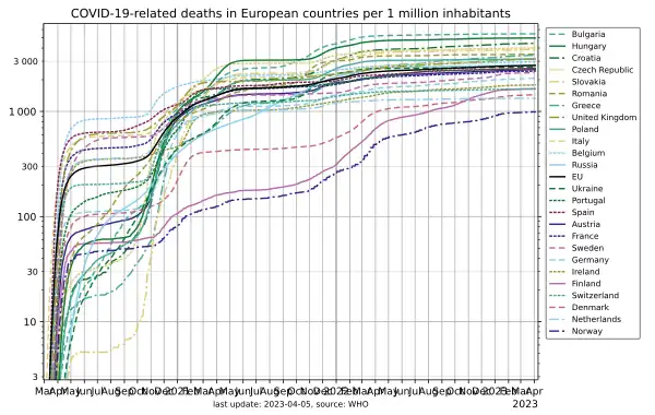 In March 2022, The Lancet published a study comparing excess mortality rates per 100,000 population, in 191 countries in the world, over the first two years of the pandemic (2020 and 2021). The study showed that amongst the major western European countries, those with the highest rates were Italy with 227, Portugal 202, Spain 187, Belgium 147, and the Netherlands 140. The average was 140 and below that were the United Kingdom at 127, France 124, and Germany 121 - the difference between these three was not statistically significant - and that Ireland (13) and the Scandinavian countries had lower rates.[11][12]