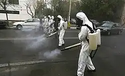 On 2 March, the government announced plans to mobilise 300,000 soldiers and volunteers to combat the spread of the virus, as well as to deploy drones and water cannons to disinfect streets.[172] On 13 March, a plan was announced to clear streets, shops, and public places by the Revolutionary Guards. In addition, 1,000 fixed and mobile detection clinics would be set up, the army would work alongside medical staff as well as producing face masks and gloves, and army beds would be made available for patients.[173]
