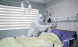 On 20 March, 1,237 new infections and 149 deaths were reported.[61] On 24 March, a new peak of 1,762 new cases was announced with 122 deaths. Rouhani said that the number of patients admitted to hospitals in different provinces as well as deaths due to the virus had decreased, which he took to be promising.[62] Iran accused Médecins Sans Frontières of being spies, and a team they had sent to Iran to help had been ordered to leave the country.[63][64]
