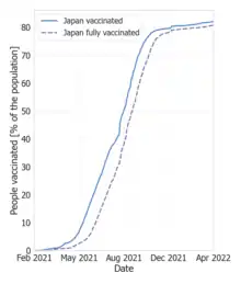 The COVID-19 vaccination in Japan began on 17 February 2021, more than a month after the first anniversary of the beginning of the pandemic in the country was commemorated. As of 22 October 2021, about 96.4 million people in Japan received at least one dose of the COVID-19 vaccine, while about 86.9 million were fully vaccinated.