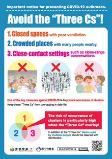 On 25 February 2020, the Abe Administration introduced the "Basic Policies for Novel Coronavirus Disease Control" (新型コロナウイルス感染症対策の基本方針) based on advice from the expert meeting.[60] After a spike of infections in Italy, Iran, and South Korea, Abe decided that the government's disease countermeasures would prioritize the prevention of large-scale clusters in Japan. This included controversial requests to suspend large-scale gatherings such as community events and school operations, as well as to limit patients with light cold symptoms from visiting medical facilities to prevent them from overwhelming hospital resources.[61]
