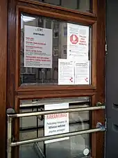 16 March: Two new cases were confirmed. Both patients were in Vilnius, and they had returned from Spain (Barcelona via Paris) and Germany.[43] Later in the day, three more cases were confirmed: one person in Telšiai who returned from the Dominican Republic on 8 March, and two people in Vilnius who returned from Austria.[44] Also on the same day, Lithuania was put under quarantine. All public indoor and outdoor gatherings were prohibited; all shops and businesses excluding grocery shops, pharmacies and veterinary pharmacies were closed; all restaurants and bars were closed, leaving the option for food take-away; borders were closed for foreigners regardless of the means of transport, excluding cargo and special transport; all international outbound passenger travel was prohibited. The quarantine was set to last until 30 March.[39] Lithuanian Railways also halted all international rail services for the duration of the lockdown.[45]