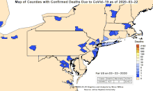 On March 10, state officials announced the first death in New Jersey to be in Bergen County. A resident of Little Ferry, 69-year-old John Brennan was the first to succumb to the virus in New Jersey. He had underlying health conditions and was taken to Hackensack University Medical Center where he died of a heart attack.[12] It would come to light days later that the man was connected to cluster of coronavirus among a New Jersey family that would kill 4 family members.[13][14]