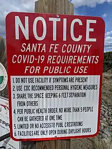 - ↑ "Update on New Mexico COVID-19 cases: Now at 35". New Mexico Department of Health. March 19, 2020. Archived from the original on March 20, 2020. Retrieved March 19, 2020.