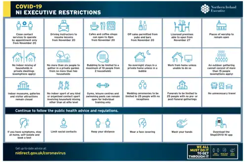 - ↑ "Covid-19 restrictions in NI extended for one more week". BBC News. Archived from the original on 12 November 2020. Retrieved 12 November 2020.