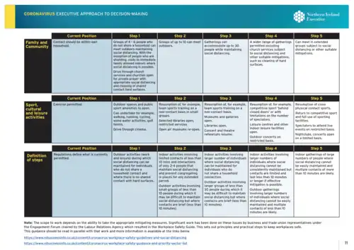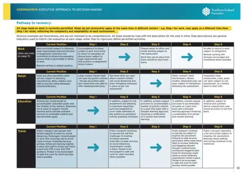 The Executive's recovery strategy sets out a pathway for us to emerge from lockdown in the safest way possible. This will require a series of judgements and decisions as we move forward. These decisions will be evidence-based, taking account of our unique circumstances here in Northern Ireland. As we embark on our phased recovery, we will remain focused on the health and wellbeing of our population; the impacts on our society; and our economy as a whole. Above all else, our priority will be saving lives.[67]