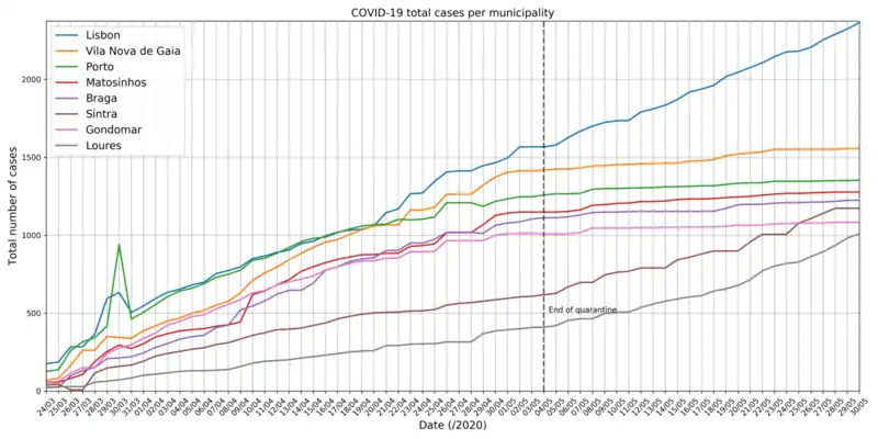 The following graph presents the total number of COVID-19 cases per day for the municipalities of Portugal with more than 1000 confirmed cases (updated on 30 May), according to the Data Science for Social Good Portugal.[70]
