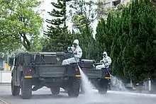 On 2 February 2020, Taiwan's Central Epidemic Command Center postponed the opening of primary and secondary schools until 25 February (originally 11 February).[201][202] In early February 2020, Taiwan's "Central Epidemic Command Center" requested the mobilization of the Taiwanese Armed Forces in both containing the spread of the virus and in building up defenses against it. Soldiers were dispatched to the factory floors of major mask manufacturers to help staff the 62 additional mask production lines that were being set up at the time.[203] In early March, Taiwan's average production of surgical face masks reached 9.2 million per day.[204] By the end of March, the daily production of surgical face masks reached 13 million.[199]
