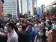 Health Minister Chen Shih-chung announced on 10 May that all China Airlines pilots currently in Taiwan, or returning to Taiwan, would be subject to quarantine for 14 days.[147] Seven new local cases were reported on 11 May, and 16 such cases – a record high in the pandemic – on 12 May.[142] President Tsai Ing-wen urged people not to panic.[142] On 14 May, with 29 new community transmission cases reported nationwide, business closures in Taipei and other northern counties were announced by local governments, to take effect the following day. Rapid testing stations were set up in Wanhua District, to which 16 of these cases were linked; this was a first in Taiwan during the pandemic.[148] After 180 new domestic infections were reported on 15 May,[149] the alert level was raised to three in the four-tier system in the Taipei area, which entailed shutting cinemas and entertainment spots, limiting gatherings to five indoors and 10 outdoors, making it mandatory for people to wear masks at all times when outside,[150] and an encouragement by the government to work and study from home. The new restrictions did not affect the high-tech manufacturing hub in Hsinchu County.[151]