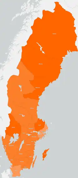 ![]() Map of Sweden showing vaccine uptake, the percent of residents aged 12+ who have had at least one dose, per county as of 20 April 2022. > 90% 85–90% 80–85% 75–80% < 75% | |