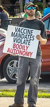 Soon after the start of the COVID-19 pandemic, preexisting anti-vaxxer social networks started online and in-person campaigns to discredit the developing COVID-19 vaccines targeting United States citizens.[8] Anti-vaccination influencers used Twitter and other social media platforms to spread vaccine misinformation.[8] Some in the medical field have given false credibility to vaccine hesitant beliefs. This caused the Federation of State Medical Boards to issue a statement in July 2021 that any physicians who generate and spread vaccine misinformation or disinformation would risk disciplinary action.[9][10]