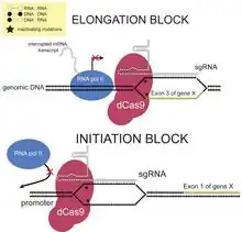 CRISPRi can sterically repress transcription by blocking either transcriptional initiation or elongation. This is accomplished by designing sgRNA complementary to the promoter or the exonic sequences. The level of transcriptional repression with a target within the coding sequence is strand-specific. Depending on the nature of the CRISPR effector, either the template or non-template strand leads to stronger repression.[13] For dCas9 (based on a Type-2 CRISPR system), repression is stronger when the guide RNA is complementary to the non-template strand. It has been suggested that this is due to the activity of helicase, which unwinds the RNA:DNA heteroduplex ahead of RNA pol II when the sgRNA is complementary to the template strand. Unlike transcription elongation block, silencing is independent of the targeted DNA strand when targeting the transcriptional start site. In prokaryotes, this steric inhibition can repress transcription of the target gene by almost 99.9%; in archaea, more than 90% repression was achieved;[14] in human cells, up to 90% repression was observed.[2] In bacteria, it is possible to saturate the target with a high enough level of dCas9 complex. In this case, the repression strength only depends on the probability that dCas9 is ejected upon collision with the RNA polymerase, which is determined by the guide sequence.[15] Higher temperatures are also associated with higher ejection probability, thus weaker repression.[15] In eukaryotes, CRISPRi can also repress transcription via an effector domain. Fusing a repressor domain to dCas9 allows transcription to be further repressed by inducing heterochromatinization. For example, the well-studied Krüppel associated box (KRAB) domain can be fused to dCas9 to repress transcription of the target gene up to 99% in human cells.[16]