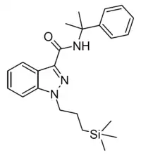 CUMYL-3TMS-PRINACA is an indazole-3-carboxamide based synthetic cannabinoid receptor agonist that has been sold as a designer drug, first identified in Sweden in May 2023. Along with the related compound ADMB-3TMS-PRINACA that was reported several months earlier, CUMYL-3TMS-PRINACA is one of the only psychoactive drugs ever reported that contains a silicon atom.[1] Another example of a silicon-containing drug is sila-haloperidol.[2]