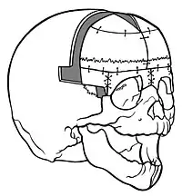 A form of surgery is the so-called fronto-supraorbital advancement and remodelling.[33] Firstly, the supraorbital bar is remodelled by a wired greenstick fracture to straighten it. Secondly, the supraorbital bar is moved 2 cm. forward and fixed only to the frontal process of the zygoma without fixation to the cranium. Lastly, the frontal bone is divided into two, rotated and attached to the supraorbital bar causing a nude area (craniectomy) between the parietal bone and frontal bone. Bone will eventually regenerate since the dura mater lies underneath (the dura mater has osteogenic capabilities). This results in an advancement and straightening of the forehead.