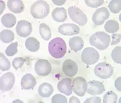 Cabot rings are thin, red-violet staining, threadlike strands in the shape of a loop or figure-8 that are found on rare occasions in red blood cells (erythrocytes). They are believed to be microtubules that are remnants from a mitotic spindle, and their presence indicates an abnormality in the production of red blood cells.[1] Cabot Rings, considerably rare findings, when present are found in the cytoplasm of red blood cells and in most cases, are caused by defects of erythrocytic production[2] and are not commonly found in the blood circulating throughout the body.[3]