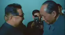 | North Korean President Kim Il Sung's calcium deposit is noticeable on the back of his head in this rare newsreel still image during a diplomatic meeting between him and Chinese leader Mao Zedong in Beijing, 1970. | |