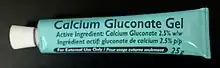 Gel preparations of calcium gluconate are used to treat hydrofluoric acid burns.[16][17] The calcium gluconate reacts with hydrofluoric acid to form insoluble, non-toxic calcium fluoride. In addition to a 2.5% calcium gluconate gel being applied directly to the chemical burn, the person may also receive calcium gluconate supplements because the fluoride ion precipitates serum calcium, causing hypocalcemia.[18]